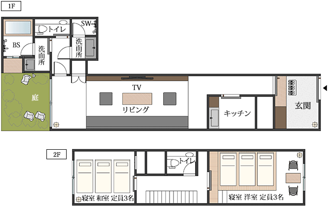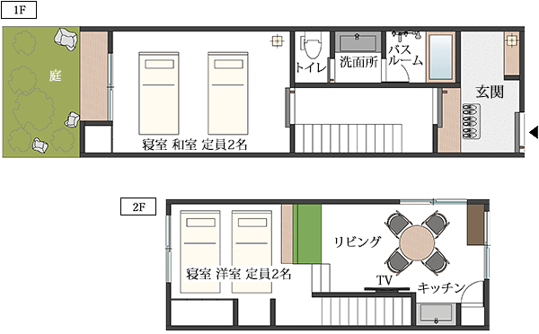 一階はミニキッチンと奥ゆきのあるリビング、二階が寝室となっています。
