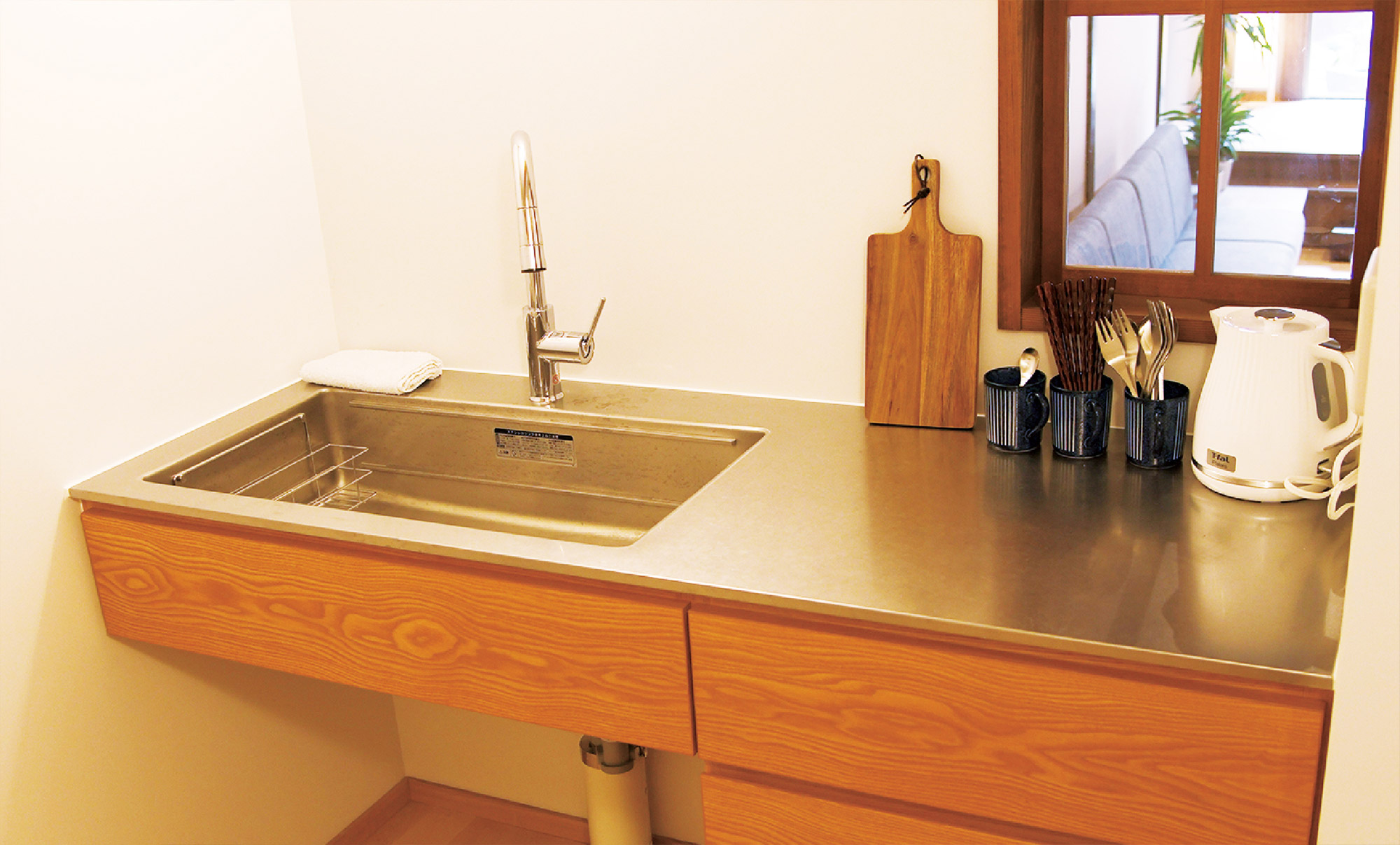 | ミニキッチン | 冷蔵庫・電子レンジ・IHコンロ・電気ケトル・グラス・湯呑み・マグカップ・小皿・カトラリー類・ワインオープナー・ぺティナイフ・まな板 |